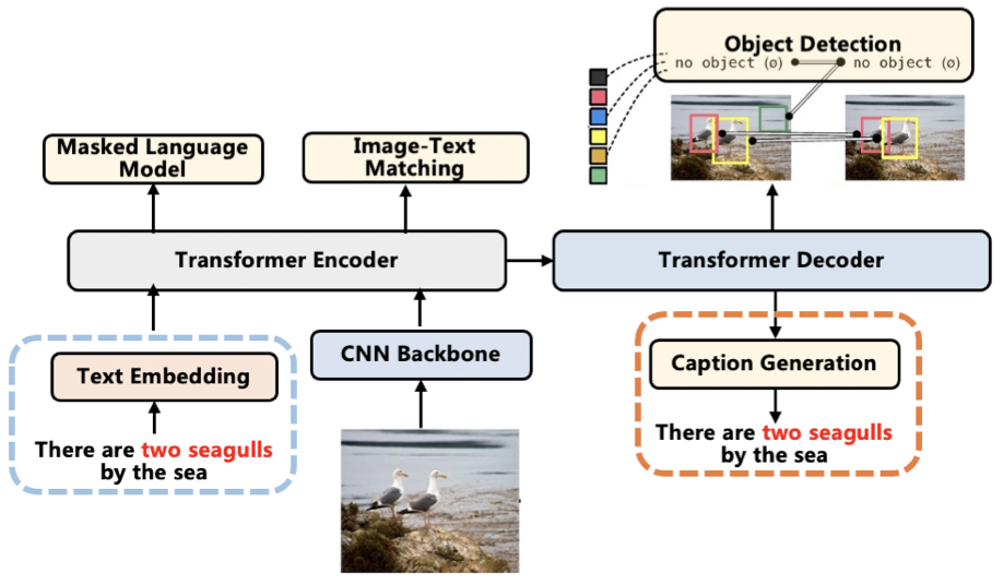 如上图所示,除了经典的 MLM 和 ITM 预训练任务之后,作者还在 Encoder 后面采用了一个 Decoder 来执行两个额外的预训练任务——object detection 和 image captioning。