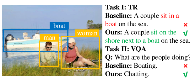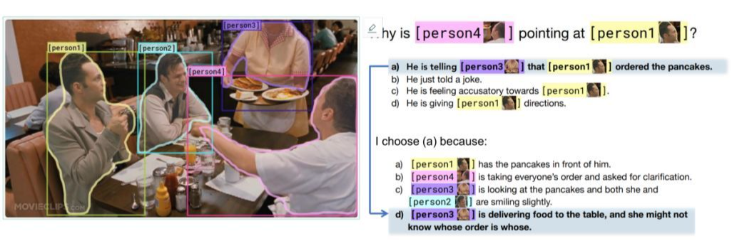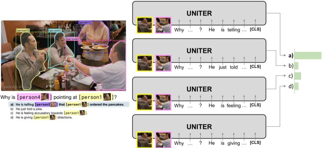 Visual Commonsense Reasoning 中,任务是以选择题形式存在的,对于一个问题有四个备选答案,模型必须从四个答案中选择出一个答案,然后再从四个备选理由中选出选择这个答案的理由。