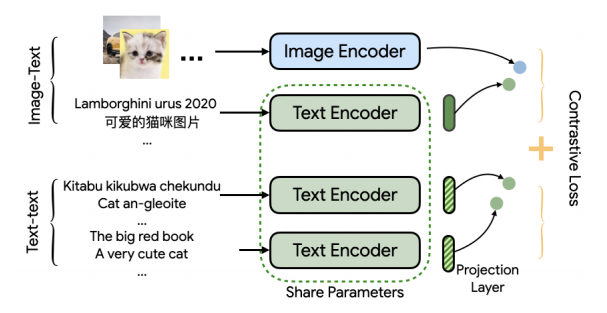 如上图所示,作者进行了两个对比学习的任务,即图文对的匹配和多语言对的匹配,同时不同语言的文本编码进行了参数共享,使得模型能够适应多语言的任务。作者在预训练过程中同时训练这两个任务,使得模型能够适应多模态、多语言的场景。