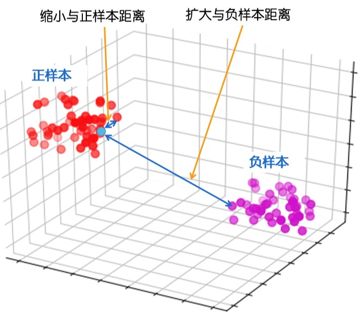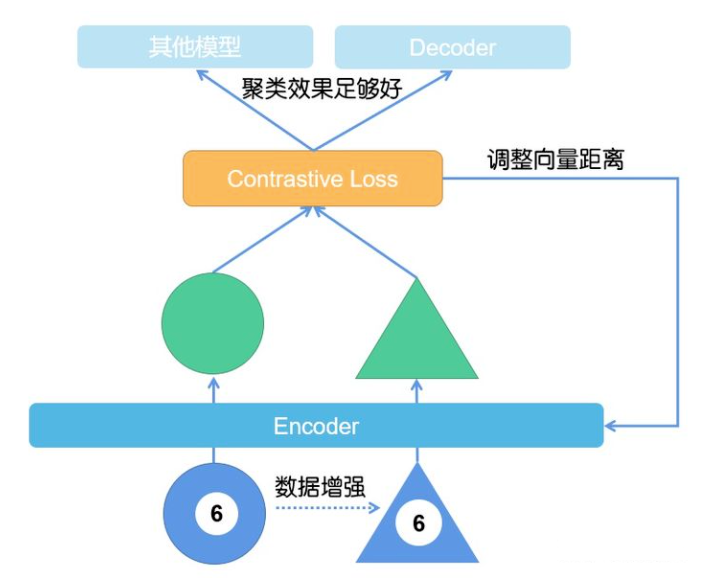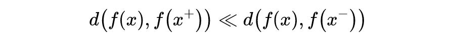 CV 领域中,和“微调+预训练”模式比较接近的方法,应该就是对比学习。对比学习同样用的是没有标注的数据,也就是说数据集里只有图片而没有标签。对比学习的目标是学习一个编码器,此编码器对同类数据进行相似的编码,并使不同类的数据的编码结果尽可能的不同 。也就是说对比学习本质上其实就是用了聚类的思想:缩小与正样本间的距离,扩大与负样本间的距离 。如下面的公式所示: