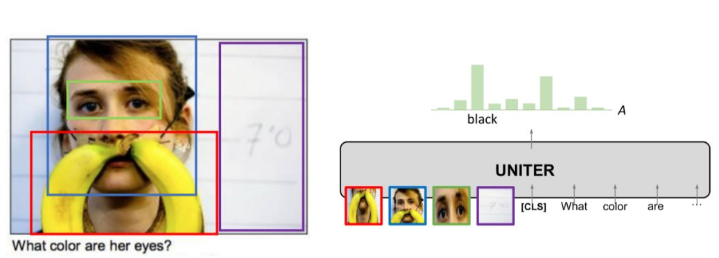 VQA 就是对于一个图片回答图片内容相关的问题。将图片和问题输入到模型中,输出是答案的分布,取概率最大的答案为预测答案。