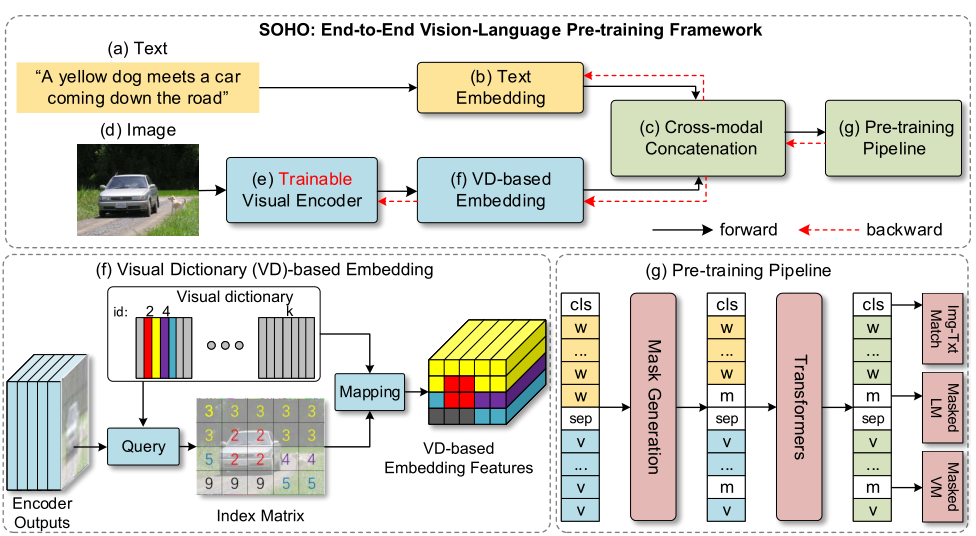 SOHO 是一个双流的预训练模型,预训练包括 ITM、MLM、MVM。这篇文章的重点是提出了一个视觉字典的概念,因为图片的像素特征非常多样,增加了模型学习的难度。因此作者提出了视觉字典 ,将每个 grid 的特征和视觉字典中的特征进行对应,相当于把每个 grid 的低级语义映射到了视觉字典中的高级语义,从而降低了优化的难度。在训练过程中,同时优化视觉字典和模型参数。