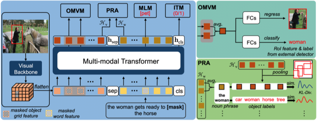 如上图所示,除了常用 MLM 和 ITM 预训练任务之后,作者还加了两个额外的预训练任务 OMVM 和 PRA 任务。