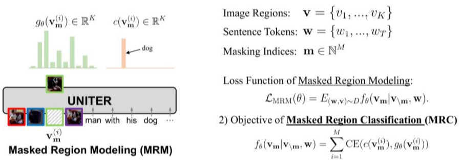 在 Masked Region Classification-KL Divergence(MRC-KL)预训练任务中,同样是随机 mask region token,但是不同的这里不是做分类任务,而是需要计算 Faster R-CNN 特征和 Mask region 的分布差异,使得 Mask region 的分布和 Faster R-CNN 特征的分布尽可能相似,所以损失函数用的是 KL 散度。