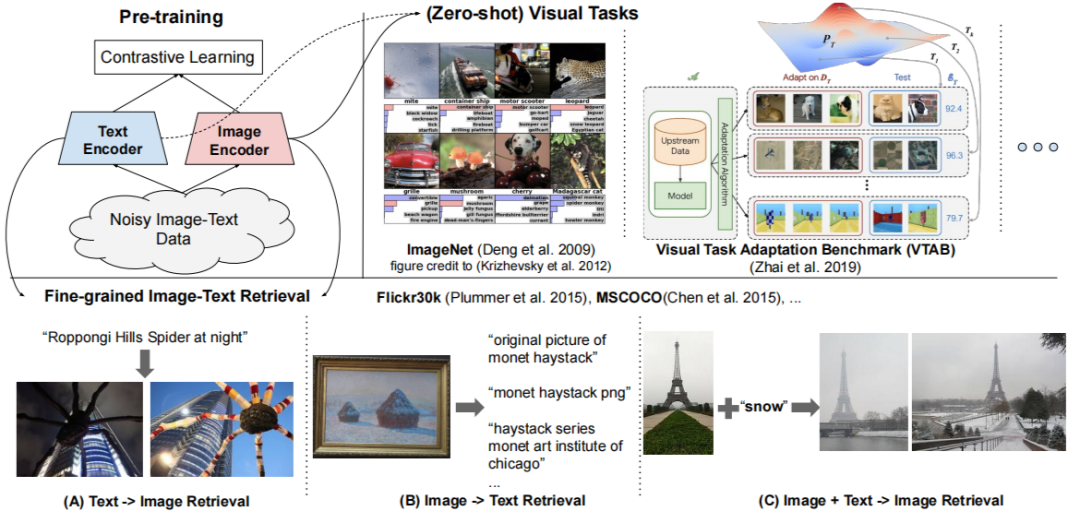 目前多模态预训练模型的数据集大多是图片-文本对,但是这些本文数据对通常是需要人工标注或者在网上爬取之后进行人工的筛选,这使得目前这类数据集中数据量的大小也就在 1000 万左右。因此,在这篇文章中,作者在网上爬取了大量图片,然后通过简单的机器筛选,剩下 10 亿个有噪声的图文对来进行训练,从而提升模型的性能。