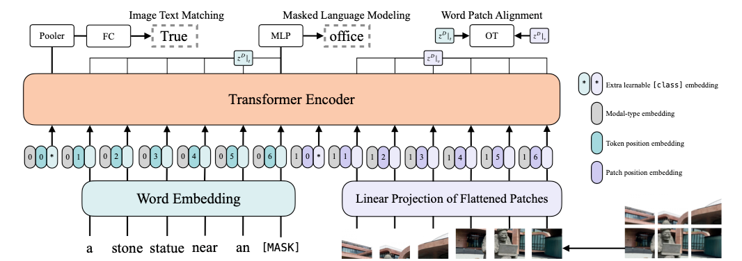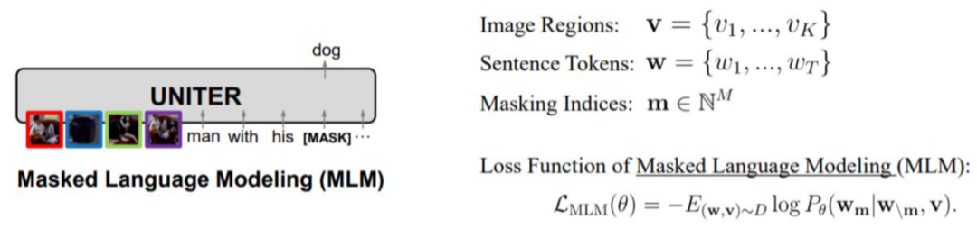 在 Masked Language Modeling(MLM)预训练任务中,需要在 sentence tokens 中随机 MASK 掉一些 token,然后模型基于其他的本文 token 和所有的图像 token 来预测这些被 mask 掉的 token。
