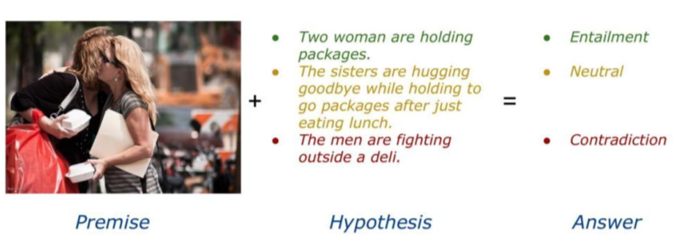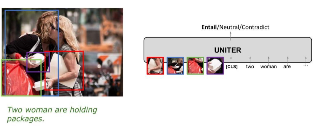 在 Visual Entailment 中,Image 是前提,Text 是假设,模型的目标是预测 Text 是不是“Entailment Image”,一共有三中 label,分别是 Entailment、Neutral 和 Contradiction。