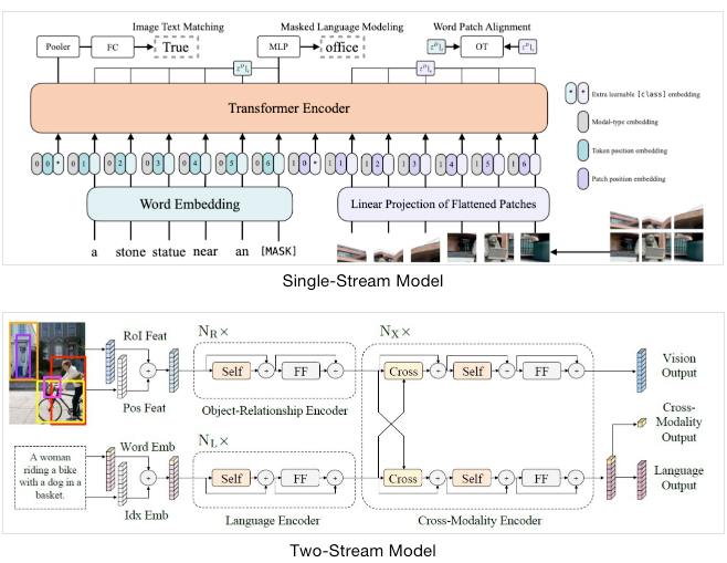 目前的多模态预训练模型按照网络的结构分类,大致可以分为两类,第一类为单流(single-stream)模型 ,第二类为双流(two-stream)模型 。如上图所示,单流模型中,视觉特征和文本特征一开始就 concat 在一起,然后直接输入到 Encoder 中;双流模型就是将视觉特征和文本特征首先在两个独立的 Encoder 中进行编码,然后再输入到 cross attention 进行多模态特征的融合。