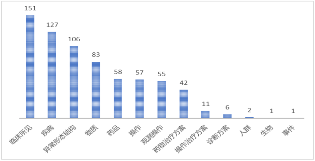 图2 “新型冠状病毒肺炎”诊疗知识图谱实体语义类型统计