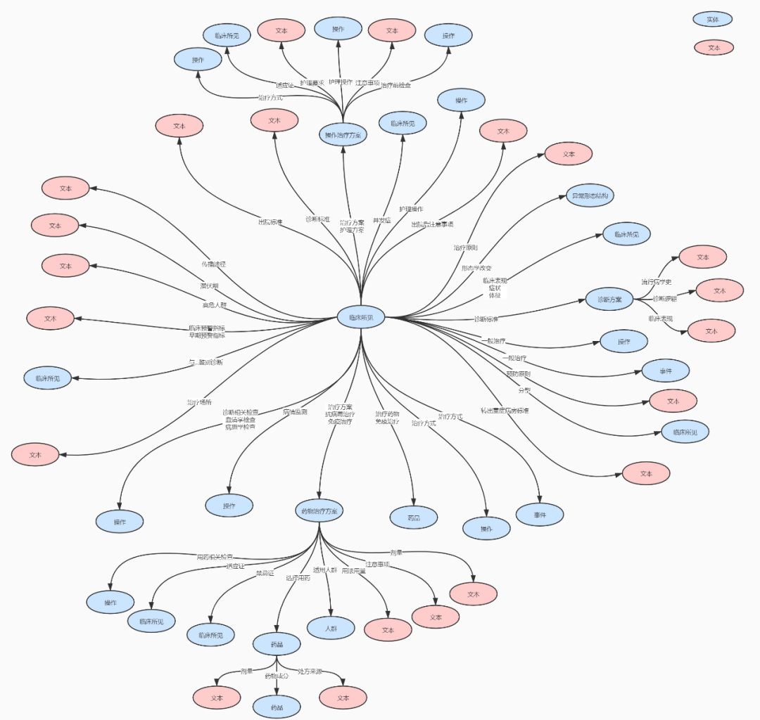 基于国家卫生健康委发布的《新型冠状病毒肺炎诊疗方案(试行第八版)》和《新型冠状病毒肺炎重型、危重型病例诊疗方案(试行第二版)》,构建了“新型冠状病毒肺炎”诊疗知识图谱的Schema,并依照Schema从文献中抽取三元组知识。