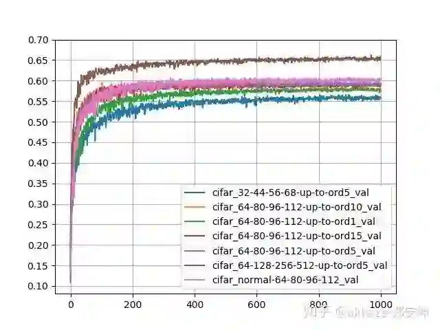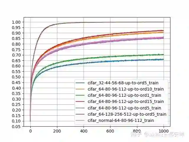 纵向比较,四个通道数相同,都是64-80-96-112的网络,使用高斯导数的阶数为1,5,10,15,发现只有ord1的预测精度偏低,但是ord5,ord10,ord15的预测精度极为相近,说明CNN可能对高阶的导数不敏感(至少在图像识别中是如此),同时,随着阶数提升,训练精度是逐个增加的,说明确实有过拟合。横向比较,都使用5阶高斯导数,但是通道数分别为32-44-56-68,60-80-96-112,64-128-256-512,发现预测精度和训练精度都是同步增加,说明通道数确实有利于组合出更多的函数出来。