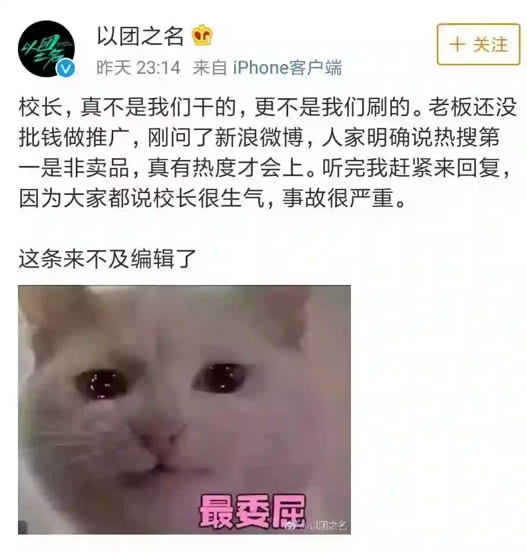 36氪讯,王思聪昨日晚间在微博发文称,优酷借用“王思聪弟弟”炒作选《以团之名》。随后,《以团之名》官方微博回应称,“王思聪弟弟”上热搜“真不是我们干的”。《以团之名》官方表示,已经问了微博,对方明确表示热搜第一是非卖品,真有热度才会上。