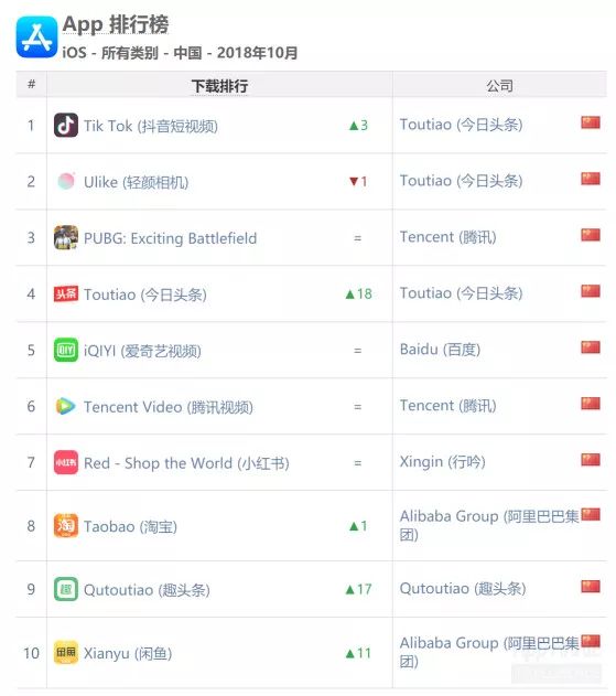 36氪讯,据App Annie数据显示,在2018年10月中国iOS下载量榜单中,今日头条系的抖音短视频和轻颜相机分别位居第一和第二,腾讯的PUBG位列第三。