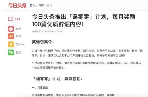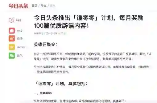 36氪讯,今日头条反谣言官方头条号“头条辟谣”宣布,推出“谣零零”反谣言计划,即日起正式实行。平台每月依据内容质量,筛选出100篇优质辟谣内容,予以现金奖励,金额从300元至3000元不等。