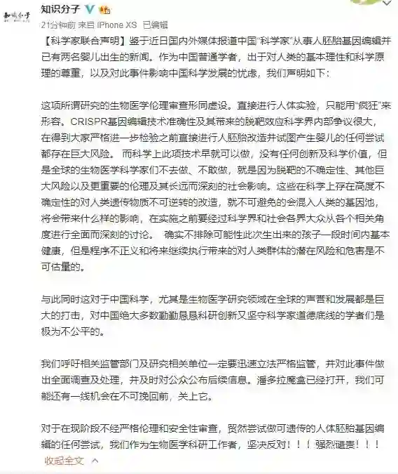 36氪讯,微博账号“知识分子”发布百余科学家联合声明,表示这项所谓研究的生物医学伦理审查形同虚设。直接进行人体实验,只能用疯狂形容。作为生物医学科研工作者,坚决反对!强烈谴责!