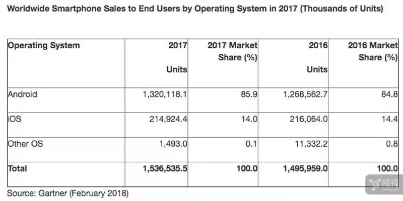数据来自研究公司 Gartner ,在2017年销售的智能手机中,99.9%搭载了这两个操作系统,其他竞争对手已经被完全排除。这其中,Android 占据86%的份额,iOS 占据14%。考虑到 Android 设备覆盖了高中低价位,并且包含无数款设备,而 iOS 主打高端市场,所以这一份额占比还是比较合理的。