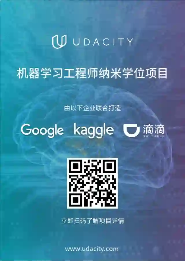 来自硅谷的前沿技术学习平台 Udacity 与 Google 、Kaggle 、滴滴出行 联合推出了“机器学习工程师”纳米学位认证项目,将带你零基础学习硅谷技术课程,全面掌握机器学习所需知识,通过一些列实战项目将预测模型实际应用于金融、医疗、教育等领域,毕业后获得 Google 技术认证证书,成为大数据、人工智能领域的抢手工程师。
