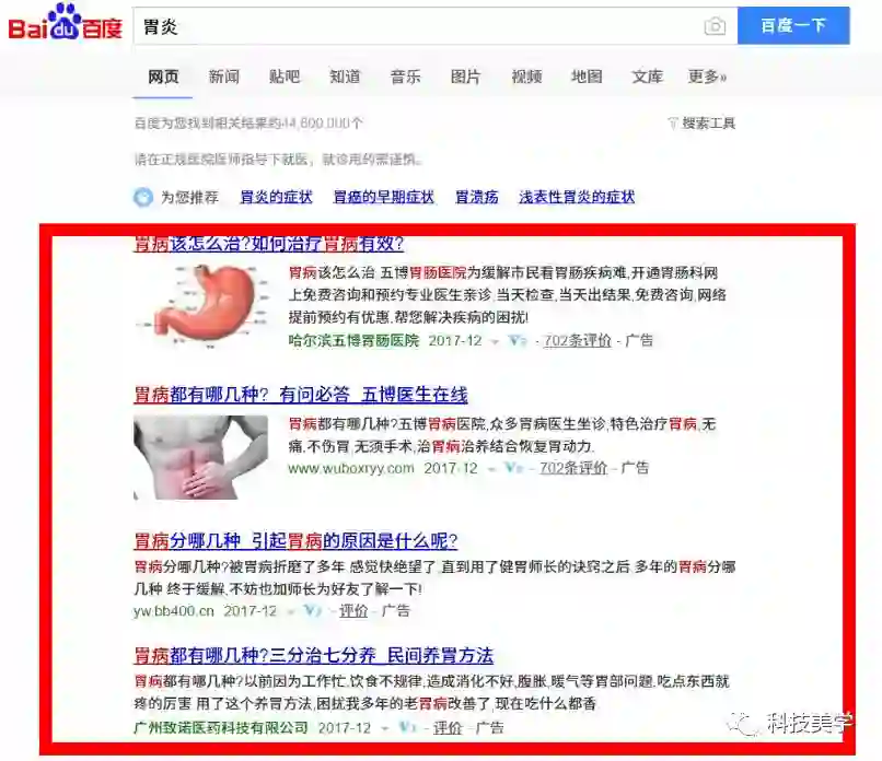而我们纵观百度首页,搜索“胃病”的所有结果,统计一下,你会发现: