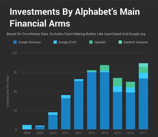 图 | Google及旗下风投历年风险投资交易次数(图源:crunchbase news)
