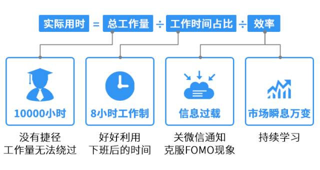 根据这条公式我们不难得出结论:如果你的实际用时特别长,要么就是因为总工作量太多,要么就是因为工作时间占比或效率太低。