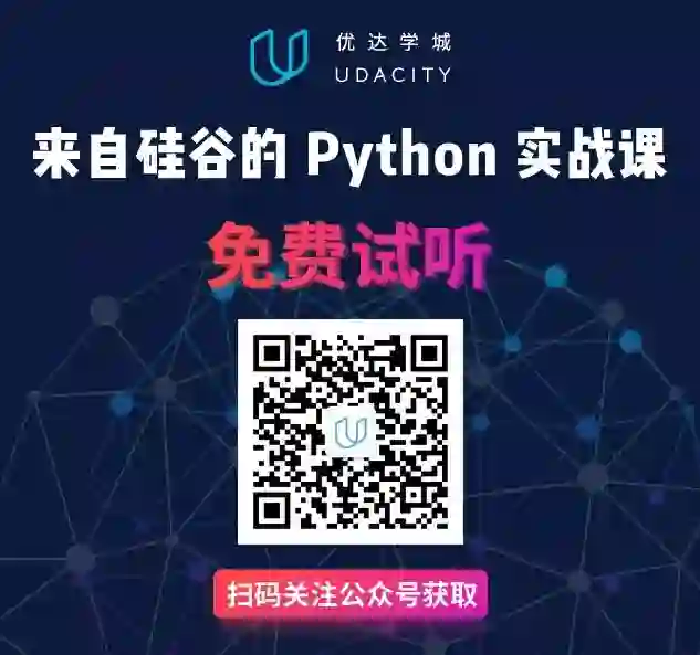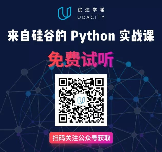 Udacity 在中国区的 Python 入门实战课程限时免费开放中!长按下方二维码,关注公众号「优达学习助手」,回复 “试听” 进入教室免费学习!