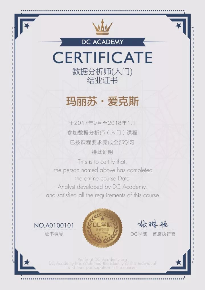 学完课程并达到要求,发放数据分析师结业证书