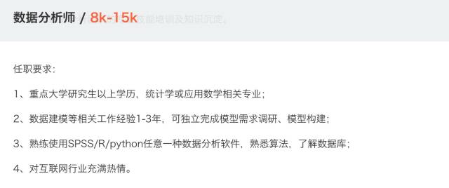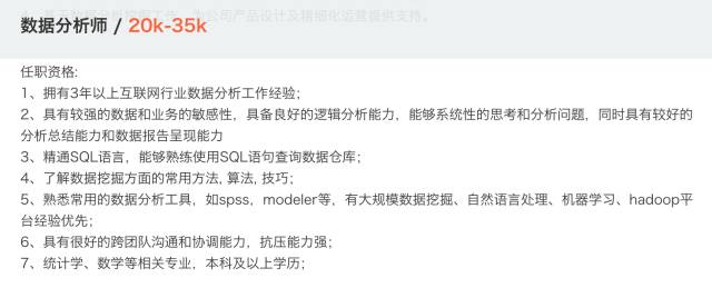 我们从拉勾上找了一些最具有代表性的数据分析师职位信息,来看看薪资不菲的数据分析师,到底需要哪些技能。
