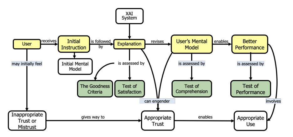 图 4:解释心理模型。黄色框说明了基本过程。绿色方框说明了测试标准。白框说明了潜在的结果。