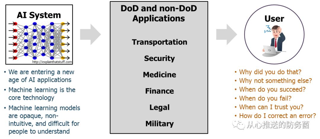 机器学习的巨大成功产生了大量人工智能(AI)应用项目。照此发展,其持续的进步有望产生能够自我感知、学习、决策和行动的自主系统。然而,这些系统的有效性受到机器当前无法向人类用户解释其决策和行动的限制(如下图)。美国国防部(DoD)面临着需要更智能、自主和共生系统的挑战。如果未来的战士能够理解,适当地信任并有效地管理新一代人工智能机器协作伙伴,那么可解释人工智能,特别是可解释的机器学习,将是必不可少的。