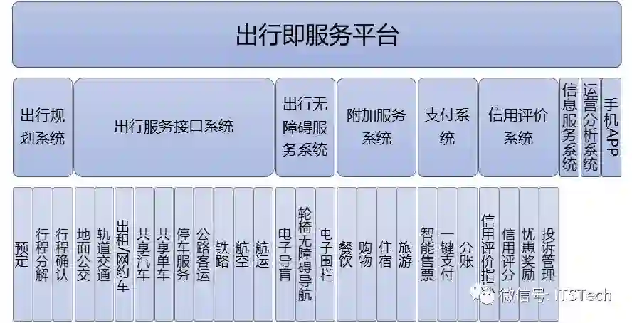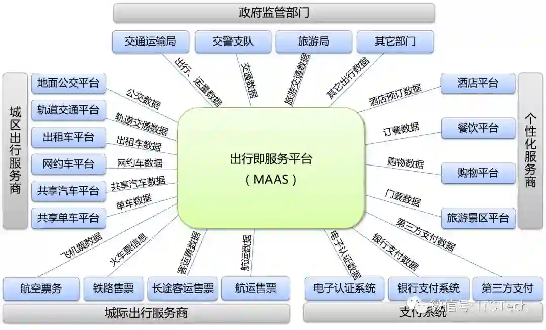 与出行即服务平台相关的主要系统平台分为政府部门、城区出行服务商、城际出行服务商、支付系统、个性化服务商等类。