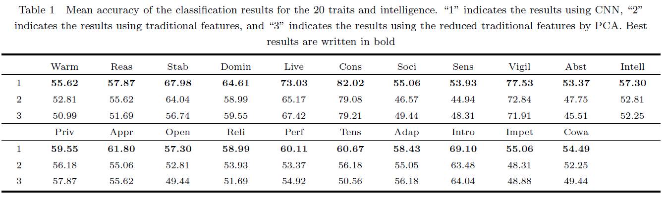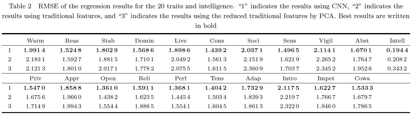 实验结果显示:“自律性”(rule-consciousness)、“乐群性”(openness)、“有恒性”(perfectionism)、“紧张性”(tension)的错误值较其他人格特征小,而“世故性”(social boldness)、“怀疑性”(vigilance)和“内外向性”(introverted or extroverted)则更大。这意味着后三种人格特征与面部特征关联较小。相比之下,智力的拟合误差(fitting error)高,因此很难通过面部图像准确预测一个人的智力水平。