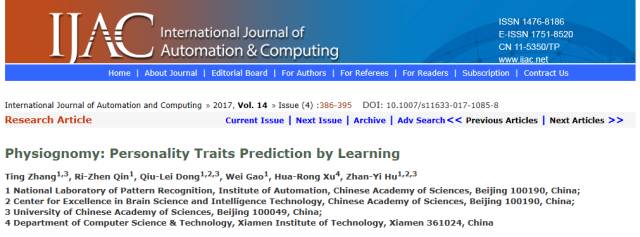 8月,IJAC第4期正式出版,来自中科院自动化所模式识别国家重点实验室的胡占义研究员及其团队用深度学习推断个性、预测智商。研究首先采集了186名在校大学生(94名男性,92名女性)的正面照片,每位大学生会对自己的人格特征进行评价,并接受智力测验,基于此,借助深度学习技术,本文进一步研究了面部照片是否可以测量智力水平和人格特征的问题。早前,在测量人格特征和智力水平时,通常借助手动特征描述器从面部照片中截取面部特征,而后使用典型的机器学习方法来训练模型。与之不同的是,本文利用端对端卷积神经网络(end-to-end convolutional neural network, CNN)来测量人格和智力,面部特征可从正面照片中自动获取。我们设计的多任务神经网络(multi-task neural network)可同时测量人格和智力。在过去的20多年里,人脸识别发展迅速,深度学习技术在人脸识别的应用上也取得了很大成功。但至今为止,还没有研究使用CNNs,通过人脸测量人格和智力,本研究可谓实现了“零的突破”。