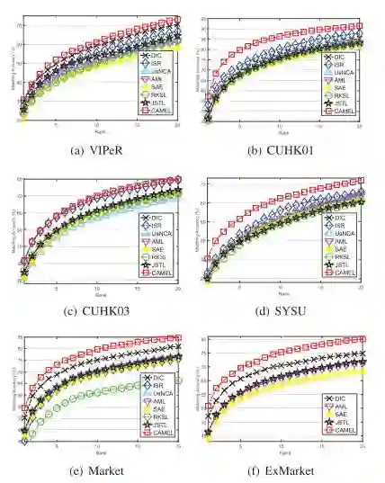 图2.CMC曲线。对于CUHK01,CUHK03和SYSU,本文将单次设置下的结果作为示例,展示出多次拍摄中可以观测到类似的图案。