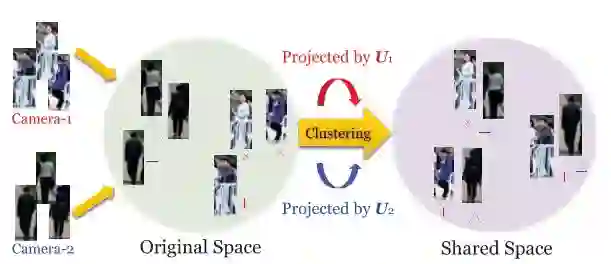 图1. 描述了特定干扰/偏差的视图以及本文思想。 来自不同相机的图像受到视图特定的干扰,例如Camera-1中的遮挡,Camera-2中的暗淡照明以及它们之间的视点变化。这些因素在原始特征空间中引入了偏差,因此无监督的重新识别极具挑战性。 本文模型通过聚类和联合学习特定视图的投影来构建数据,从而找到一个共享空间,其中视图特定偏差得意减小且得到更好的效果。