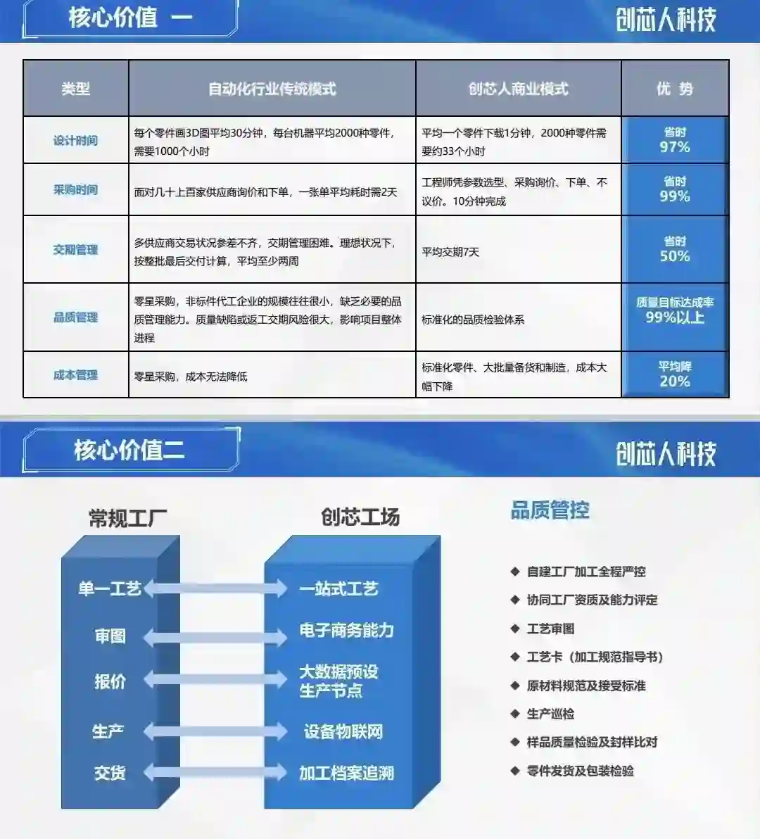 相较于自动化行业传统模式,通过国工科技平台,自动化设备商可以节省97%的设计时间,99%的采购时间,产品交付周期可缩短一半,产品质量实现99%以上的合格率,整体管理成本下降20%。