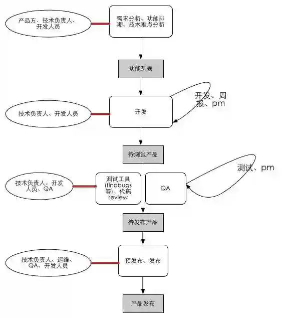 更为具体的一个研发流程则如下图所示,标注了每一个环节的参与角色。