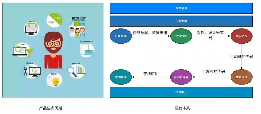 可知,即时沟通和技术提升虽然不属于研发流程中的某一个环节,但它们是贯穿整个研发体系不可或缺的一部分,有着不可替代的作用。此外,任务管理需要对任务做整个研发生命周期的管理,除了作为其中的一个关键环节,也是贯穿整个研发流程的。