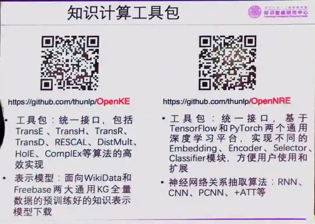 在世界知识的获取、表示与计算方面,中心还研制发布了很多开源工具和评测数据集,如知识表示学习工具包OpenKE、神经网络关系抽取工具包OpenNRE、Few shot learning关系抽取数据集FewRel等,自发布以来获得学术界与产业界广泛使用。