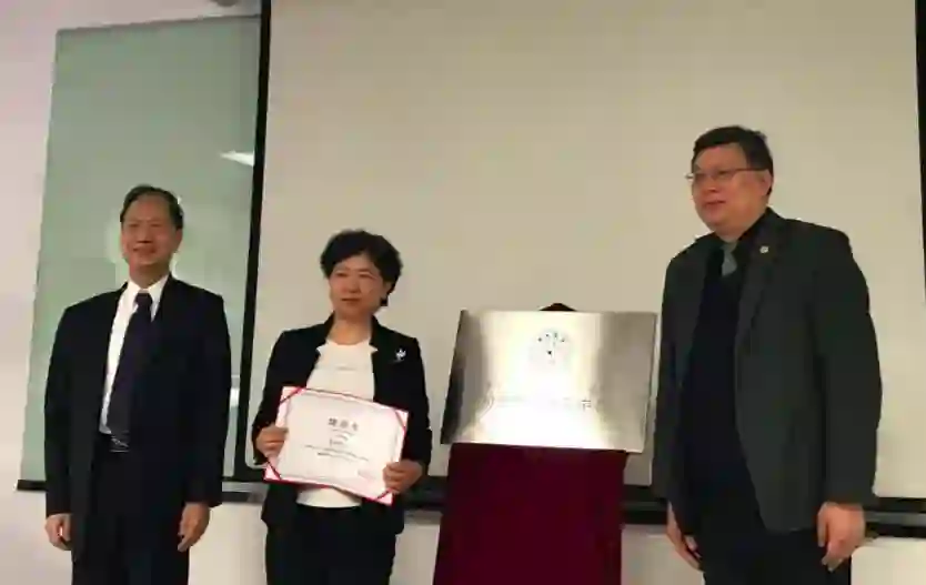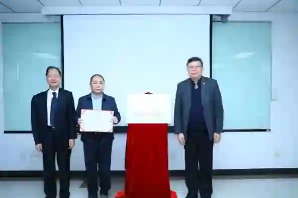 知识智能研究中心揭牌仪式上,清华大学人工智能研究院院长张钹院士(左),清华大学副校长、清华大学人工智能研究院管委会主任尤政院士(右),为李娟子教授颁发知识中心主任聘书。
