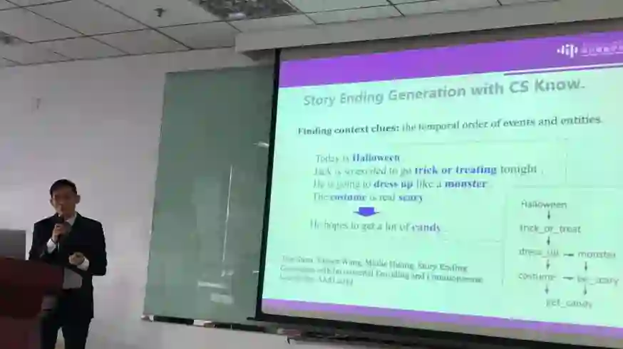 此外,清华大学计算机系副教授黄民烈还在会上做了报告《知识计算典型案例——常识知识感知的语言生成初探》,主要介绍了两项工作:一是结合常识进行对话生成,一是符合逻辑的故事结局的生成。