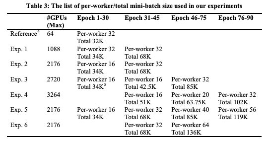 我们调整每个worker和总batch size,如表3所示,直到将总batch size增到最大。通过增加GPU的数量(Exp.1到Exp.4)来尝试提高最大总batch size。