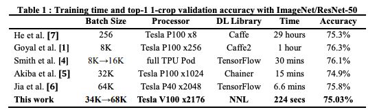 这些技术是用神经网络库(NNL)实现的,我们使用了2176个 Tesla V100 GPU,训练时间224秒,验证精度75.03%。我们还通过1088个Tesla V100 GPU达到了90%以上的GPU扩展效率。