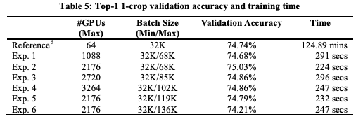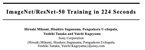 索尼团队的研究着重于解决大型mini-batch训练的不稳定性和梯度同步开销,他们使用2176 个Tesla V100 GPU,将训练时间缩短至224秒,验证精度为75.03%。
