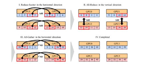 图2:在2x2网格中,一个4-GPU集群的2D-Torus all-reduce步骤