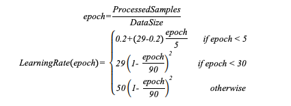 使用LARS [9],系数为0.01,eps为1e-6更新权重。学习率(LR)通过以下公式计算: