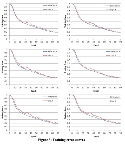 训练误差曲线与参考曲线非常相似(图3)。虽然最大的batch size可以增加到119K也不会造成明显的精度损失,但进一步增大会使精度降低约0.5%(表5中的实验6)。