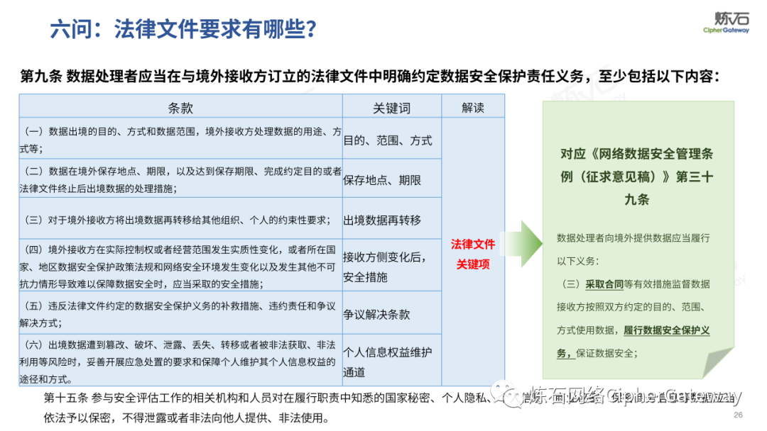 第九条 数据处理者应当在与境外接收方订立的合同充分法律文件中明确约定数据安全保护责任义务,应当至少包括但不限于以下内容: