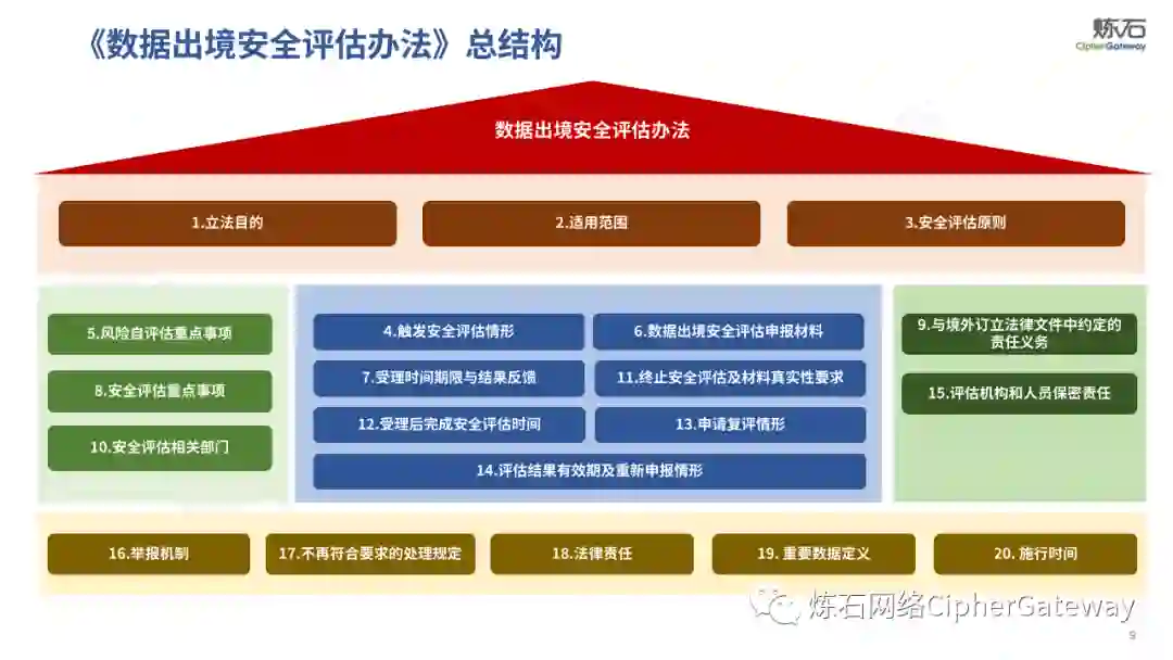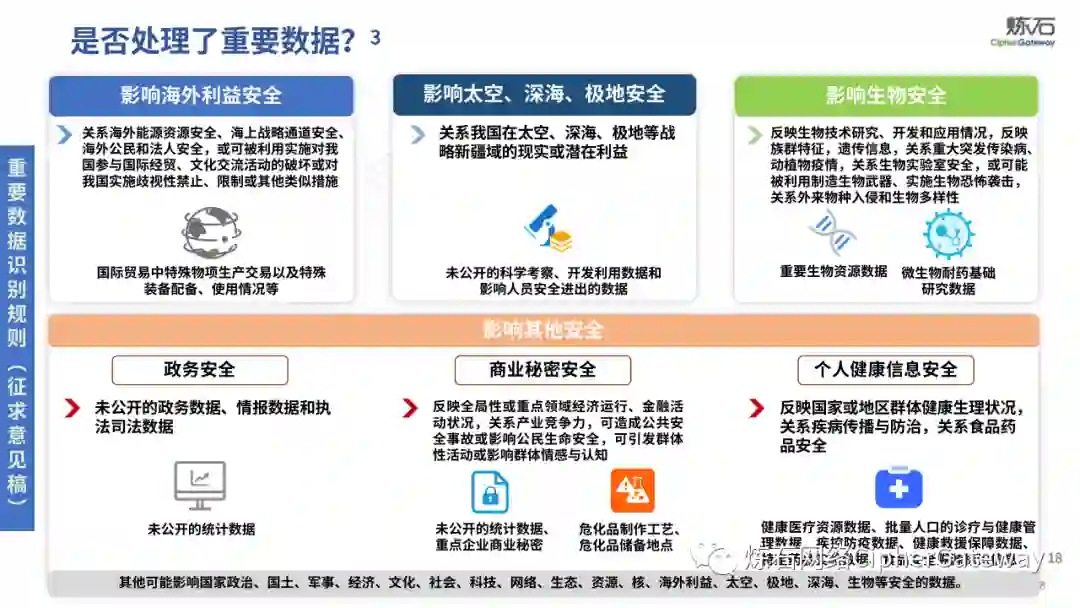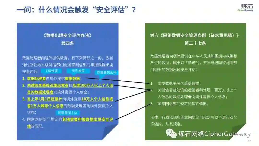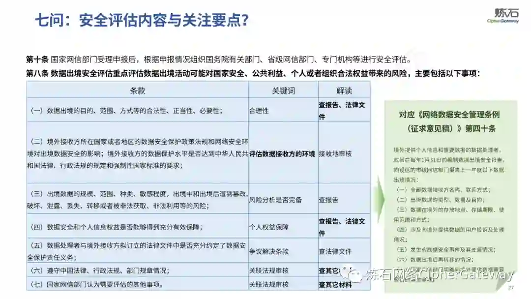 炼石回顾梳理了数据出境相关法律法规发布历程,剖析出境场景、重要数据、个人信息、风险自评估、安全评估等关键词,结合安全评估触发条件、安全评估流程、安全评估申报、自评估报告、安全评估周期、关基范围、重要数据范围等系列问题提出“十问”,分析数据出境中应知必会和合规实现,同时炼石从业务视角分析数据安全的需求来源和实践思路,并探索了数据安全的新框架、新战法。同时,炼石也对《办法》最终稿与征求意见稿的18条修订进行对照,供读者参考。