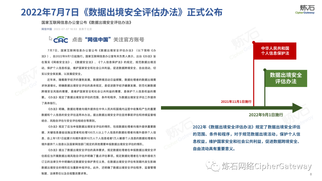 2022年7月7日,国家互联网信息办公室公布《数据出境安全评估办法》(以下简称《办法》),自2022年9月1日起施行。近年来,随着数字经济的蓬勃发展,数据跨境活动日益频繁,数据处理者的数据出境需求快速增长。同时,由于不同国家和地区法律制度、保护水平等的差异,数据出境安全风险也相应凸显。数据跨境活动既影响个人信息权益,又关系国家安全和社会公共利益。世界上许多国家和地区相继从本国、本地区实际出发,对数据跨境安全管理作了制度探索。制定出台《办法》是落实《网络安全法》、《数据安全法》、《个人信息保护法》有关数据出境规定的重要举措,目的是进一步规范数据出境活动,保护个人信息权益,维护国家安全和社会公共利益,促进数据跨境安全、自由流动。