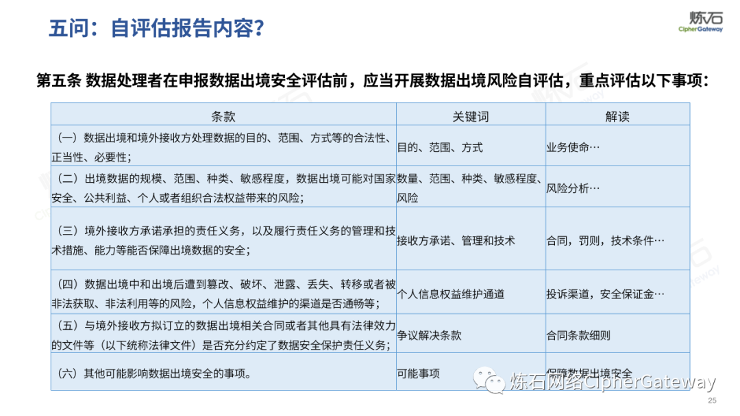 第五条 数据处理者在向境外提供申报数据前,应事先出境安全评估前,应当开展数据出境风险自评估,重点评估以下事项: